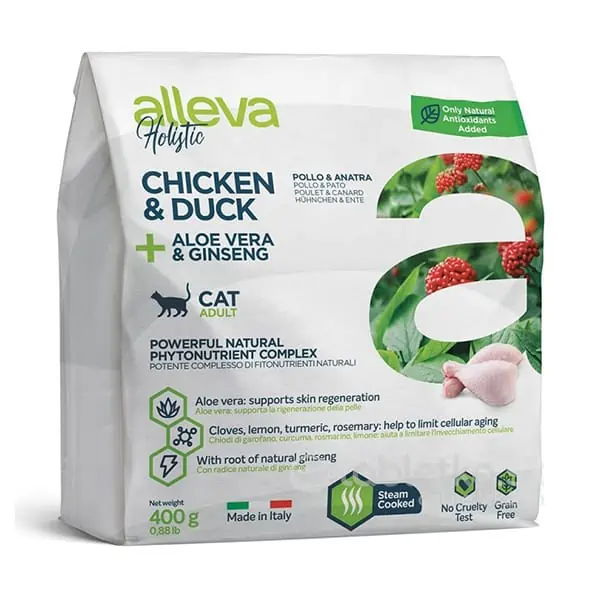 Alleva HOLISTIC cat chicken & duck adult 0,4kg5,59 € Na sklade Holistické krmivo pre dospelé mačky. Na posilnenie imunitného systému, podporu zdravej kože a urýchlenie hojenia rán. ...