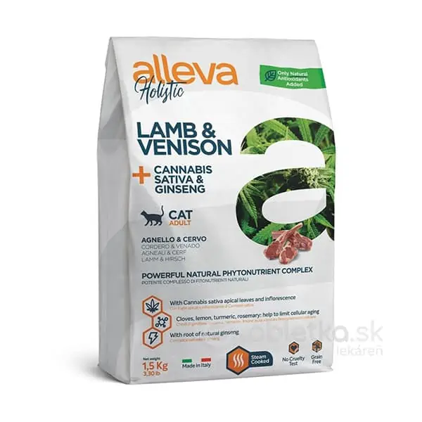Alleva HOLISTIC cat lamb & venison adult 1,5kg14,55 € Na sklade Kompletné krmivo pre dospelé mačky z jahňaciny a srnčieho mäsa doplnené koktailom fytonutrientov. ...