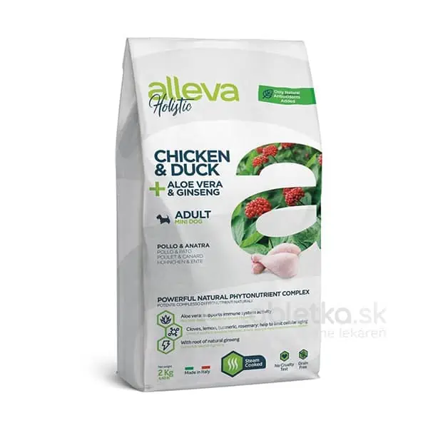 Alleva HOLISTIC dog adult mini chicken & duck 2kg19,90 € Na sklade Kompletné krmivo pre dospelé psy malých plemien. ...