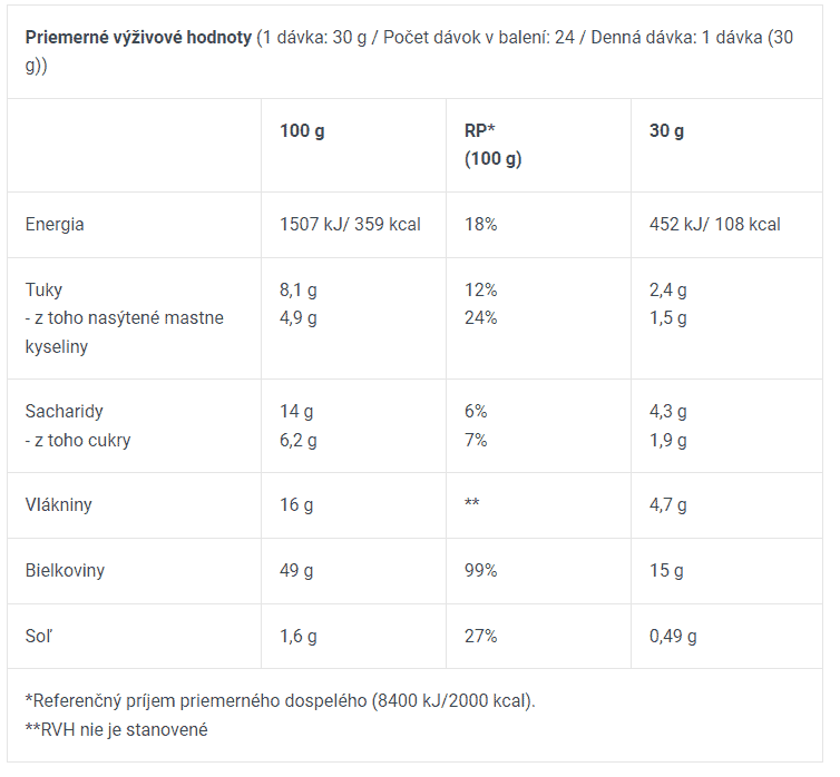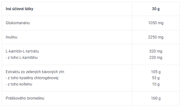 instantný srvátkový proteínový koncentrát 61% [srvátkový proteínový koncentrát, emulgátor: lecitíny (sója)], nízkotučný kakaový prášok, inulín, múka z ovsených vločiek (obsahuje lepok), glukomanan 3,5% [z hľúz zmijovca indického (Amorphophallus konjac) (obsahuje oxid siričitý)], arómy, zahusťovadlo (celulózová guma), L-karnitín L-tartrát 1%, emulgátor: lecitíny (sója), citrusová vláknina, prášok z ľanových semien, prášok zo šupiek semien skorocelu indického (Plantago ovata) (Psyllium), prášok z bobúľ acai 0,6%, prášok z bobúľ goji 0,6%, soľ, prášok bromelain 0,53%, vápenaté soli kyseliny ortofosforečnej, extrakt z bôbov zelenej kávy (Coffea robusta), sladidlo (sukralóza), protihrudkujúca látka (oxid kremičitý), chlorid chromitý. Vyrobené v závode kde sa vyrábajú potraviny obsahujúce mlieko, vajcia, lepok, sóju, arašidy, kôrovce, ryby, mäkkýše, oxid siričitý a orechy.