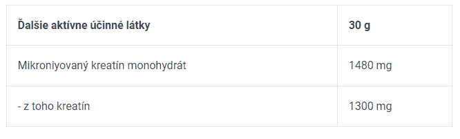 Protein Blend 71% [sójový proteínový izolát, srvátkový proteínový koncentrát, kazeinát vápenatý (obsahuje mlieko)], kakaový prášok s nízkym obsahom tuku, zvýrazňovač chuti (glycín a jeho sodná soľ), mikronizovaný kreatín monohydrát 5%, arómy, protihrudkujúce látky (horečnaté soli mastných kyselín, oxid kremičitý), soľ, emulgátor: lecitíny (sója), sladidlá (sukralóza, acesulfám K), zahusťovadlo (celulózová guma).