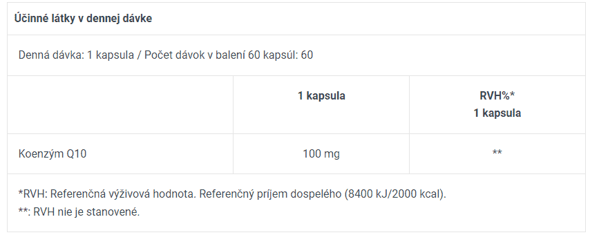 objemové činidlo (fosforečnany vápenaté), kapsula [želatína, povlaková látka (šelak), farbivo (oxidy a hydroxidy železa), regulátor kyslosti (hydroxid amónny), regulátor kyslosti (hydroxid draselný)], koenzým Q10 10,3%, protihrudkujúca látka (horečnaté soli mastných kyselín). Vyrobené v závode kde sa spracovávajú potraviny obsahujúce mlieko, vajcia, lepok, sóju, kôrovce, oxid siričitý a orechy.