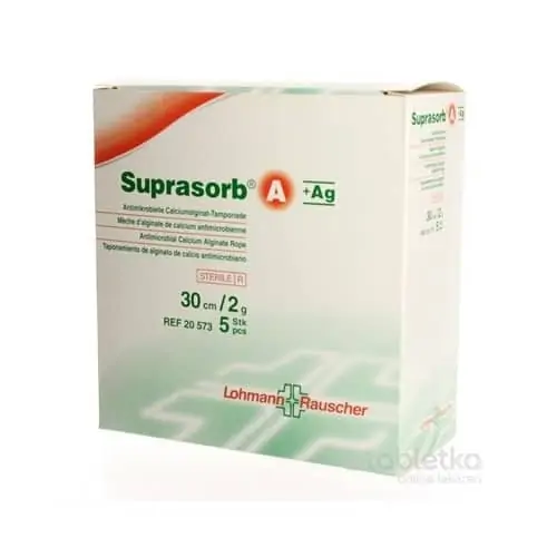 - Antimikrobiálne kalciumalginátové kompresy/tamponády Suprasorb® A + Ag sú zložené z homogénnej zmesi z kalciumalginátových vlákien a alginátových vlákien s obsahom striebra (1,5 % iónového striebra).